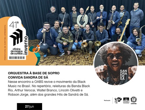 27 DE JUNHO (QUI) ORQUESTRA À BASE DE SOPRO CONVIDA SANDRA DE SÁ Nesse encontro a OABS revive o movimento da Black Music tão difundido no Brasil entre os anos 70 e 80. No repertório, releituras da Banda Black Rio, Arthur Verocai, Waltel Branco, Lincoln Olivetti e Robson Jorge, além dos grandes Hits de Sandrá de Sá. 20h L. Auditório Bento Munhoz da Rocha Neto (Guairão) R$ 50 R$ 25