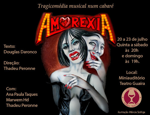 Depois de grande sucesso de público e de crítica alcançados em 2014, 2015 e 2016 volta em cartaz em Curitiba em curtíssima temporada o Espetáculo AmorexiA- Tragicomédia Musical Num Cabaré de 20 a 22 às 20h e dia 23 às 19h de julho no Mini Auditório do Teatro Guaíra.
